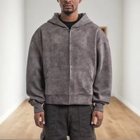 Sudadera con capucha y cremallera de lana de algodón 100% para hombre, parches con estampado Floral de ajuste Regular, lavado desgastado, tela de 350g sostenible
